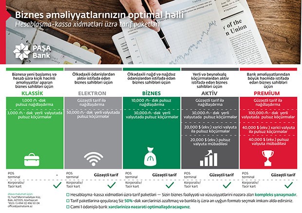 PAŞA Bank kiçik və orta sahibkarlar üçün təqdim etdiyi yeni hesablaşma-kassa xidmətləri paketinin şərtlərini açıqlayıb. Tarif paketləri çərçivəsində müəyyən əməliyyatlarda komissiyaların tətbiq edilməməsi diqqəti cəlb edir.