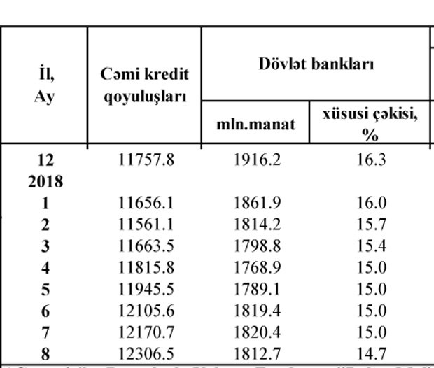 Sentyabr ayının əvvəlinə 12 milyard 306.5 milyon manat cəmi kredit qoyuluşlarının 14.7%-nin ödəmə vaxtı keçib. Avqustun əvvəlində bu nisbət 15% idi.