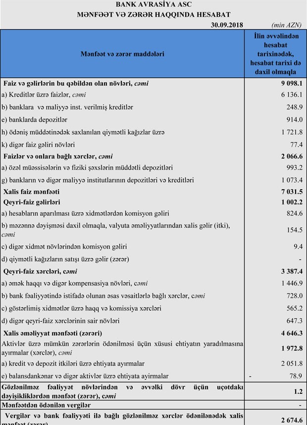 Cari ilin 9 ayı ərzində “Bank Avrasiya” 4 milyon 646 manat xalis əməliyyat mənfəətinin 1 milyon 973 min manatını ehtimal olunan kredit və depozit itkiləri üçün yaradılan ehtiyatlara ayırıb. Nəticədə Bank, yanvar-sentyabr dövrünü 2 milyon 674 min manat xalis mənfəət ilə bağlayıb.