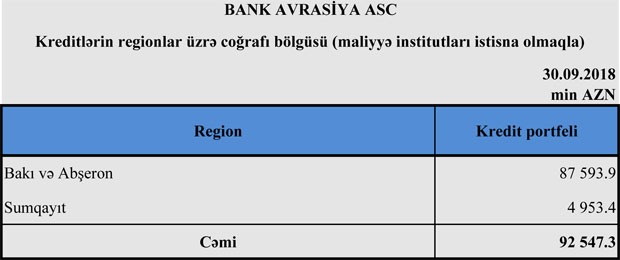 30 Sentyabr 2018-ci il tarixində "Bank Avrasiya" 153 milyon 355 min manat cəmi aktivlərə (o cümlədən 86 milyon 780 min manat müştərilərə verilən kreditlər və 24 milyon 380 min manat qiymətli kağızlara investisiya), 89 milyon 469.7 min manat cəmi öhdəliklərə və 63 milyon 886.1 min manat balans kapitalına malik idi.