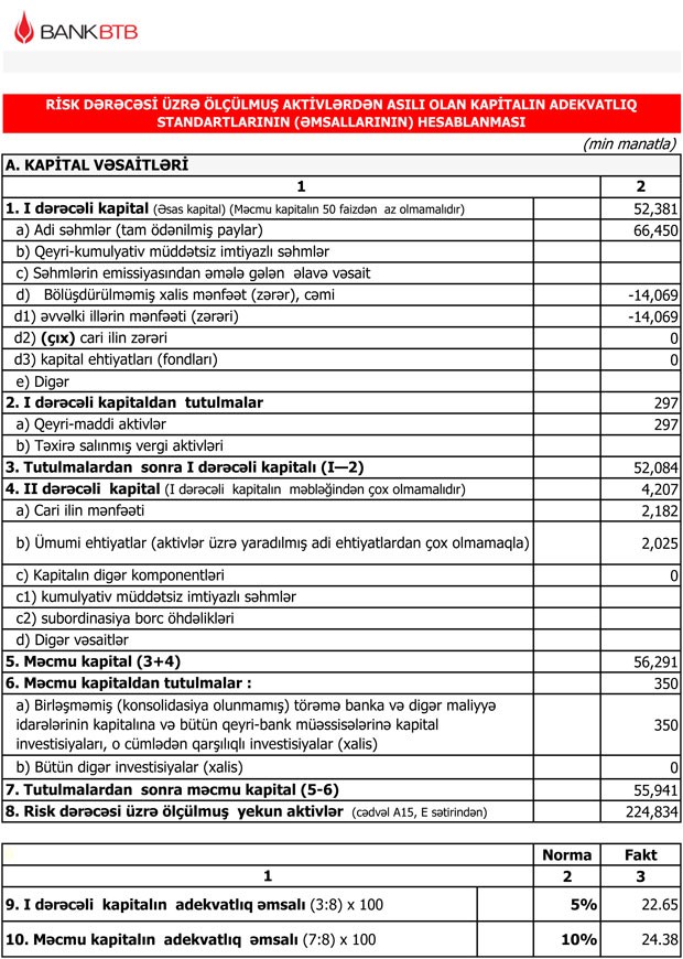 "Bank BTB” ASC 2016-cı ilin 9 ayında isə 5 milyon 640 min manat cəmi gəlir əldə etmiş, 3 milyon 856 milyon manat xərc çəkmiş və 1 milyon 784 min manat əməliyyat mənfəəti əldə etmişdi. Lakin ehtiyatlara 3 milyon 747 min manat ayırdığı üçün, ötən ilin 9 ayını 1 milyon 963 min manat zərər ilə başa vurmuşdu.