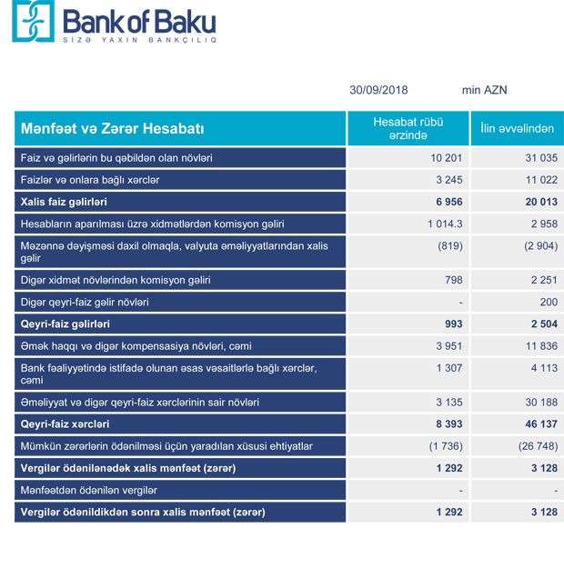 "Bank of Baku” ASC 2018-ci ilin 9 ayını 3 milyon 128 min manat xalis mənfəət ilə başa vurub. Müqayisə üçün qeyd edək ki, Bank ötən ilin eyni dövrünü 31 milyon 890 min manat xalis zərər ilə bağlamışdı.