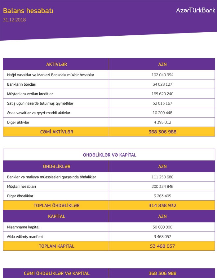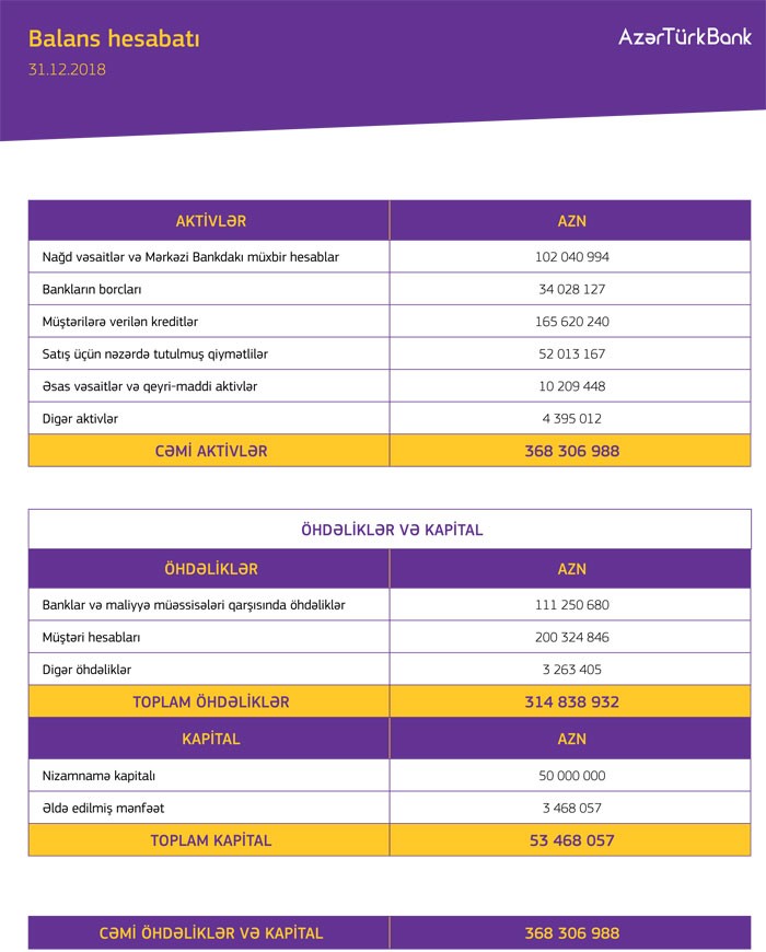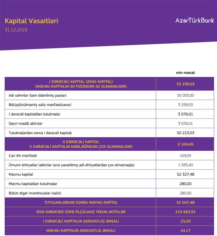 31 Dekabr 2018-ci il tarixində “Azər-Türk Bank” 53 milyon 468 min manat cəmi balans kapitalına malik olub.
