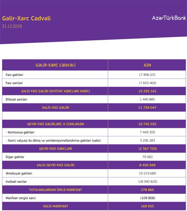 Faiz və qeyri-faiz xərcləri çıxıldıqdan sonra Bankın 19 milyon 220 min manat əməliyyat gəlirləri olub. 18 milyon 941 min manat inzibati xərclər çıxıldıqdan sonra Bank 278 min 860 manat mənfəət əldə edib. Mənfəətdən 109 min 806 manat mənfəət vergisi ödənilib. Nəticədə “Azər-Türk Bank” ASC 2018-ci ili 169 min 55 manat xalis mənfət ilə bağlayıb.
