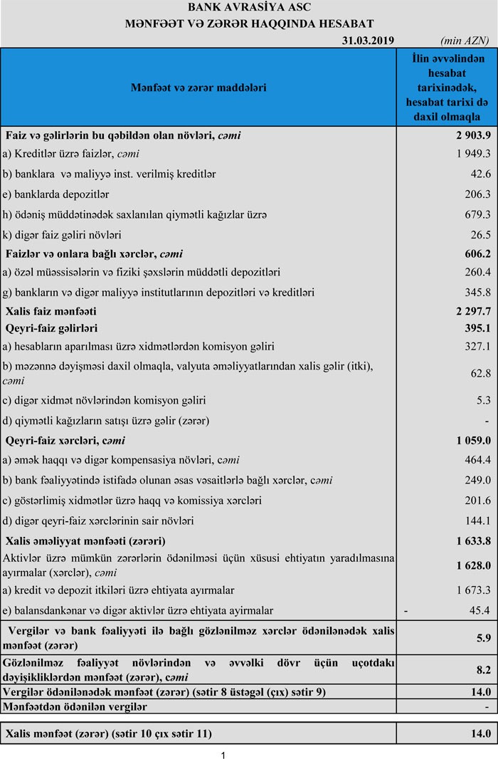 Müqayisə üçün qeyd edək ki, 2018-ci ilin yanvar-mart dövründə "Bank Avrasiya"nın cəmi gəlirləri 3 milyon 326 min manat, cəmi xərcləri 1 milyon 711 min manat təşkil etmiş və 1 milyon 615 min manat əməliyyat mənfəəti formalaşmışdı. Eyni zamanda, ehtiyatlardan (kredit və depozit itkiləri üzrə yaradılmış ehtiyat) 1 milyon 617 min manat gəlirə çevrilmiş və nəticədə bankın mənfəəti 3 milyon 233.7 min manata yüksəlmişdi.