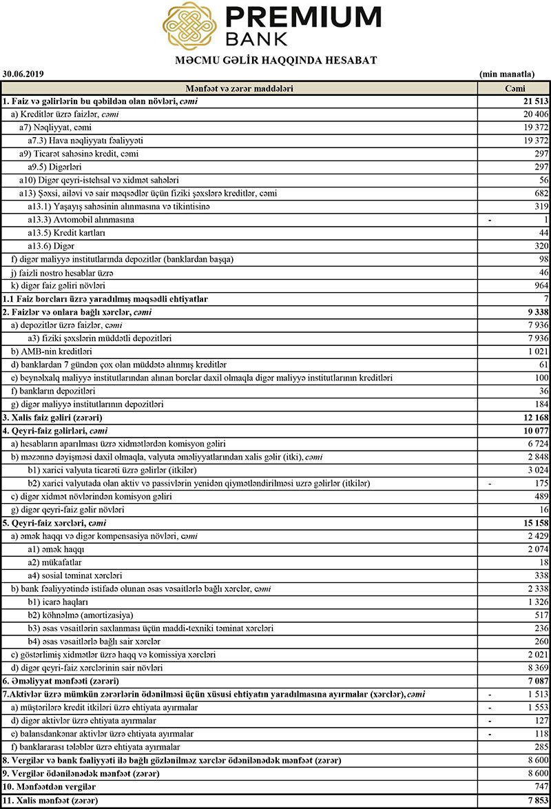 Müqayisə üçün qeyd edək ki, ötən ilin yanvar-iyun dövründə “Premium Bank”ın cəmi gəlirləri 26 milyon 990 min manat, cəmi xərcləri 22 milyon 77 min manat, əməliyyat mənfəəti 4 milyon 912 min manat təşkil etmişdi. Ehtimal olunan depozit və kredit itkiləri üzrə yaradılan ehtiyatdan 7 milyon 613 min manat azad olduğundan Bankın xalis mənfəəti 12 milyon 256 min manata yüksəlmişdi.