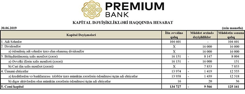 Əvvəlki illərin 16 milyon 151 min manat xalis mənfəəti bölüşdürüldüyündən cəmi kapital 134 milyon 727 min manatdan 125 milyon 161 min manata düşüb.