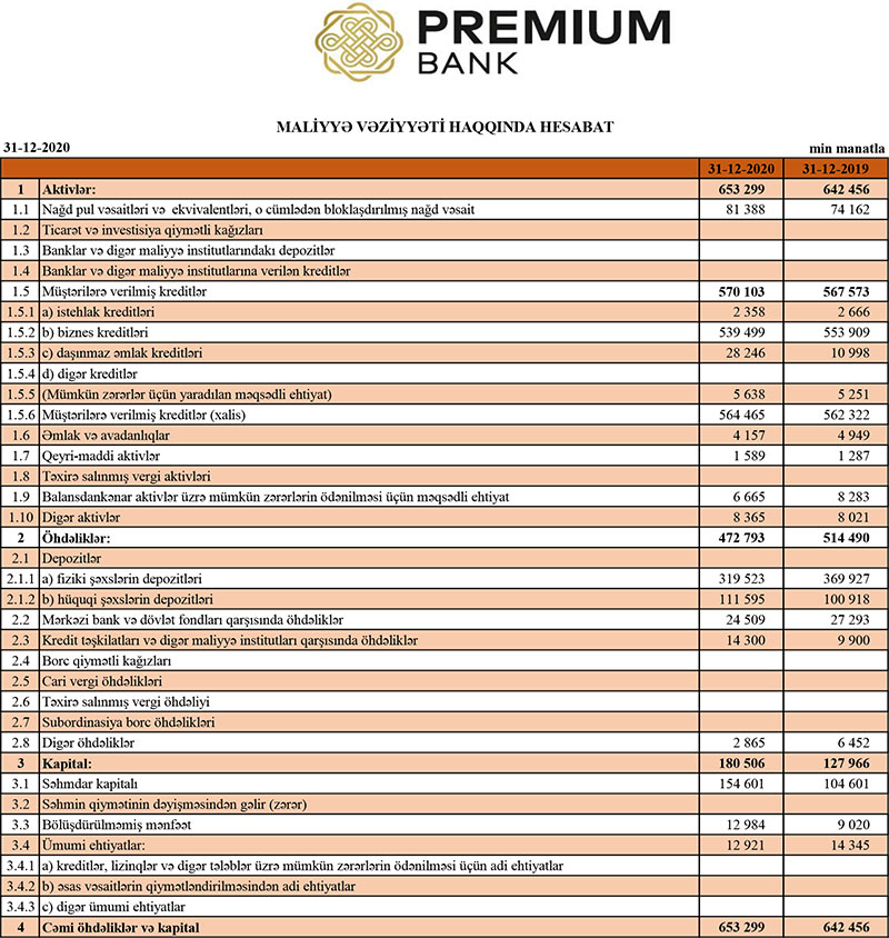 2019-cu illə müqayisədə 2020-ci ildə “Premium Bank”ın cəmi aktivləri 10 milyon 843 min manat və ya 1.7% artaraq 653 milyon 299 min manata yüksəlib. Müştərilərə verilmiş kreditlər isə 2 milyon 530 min manat artaraq 570 milyon 103 min manata çatıb.