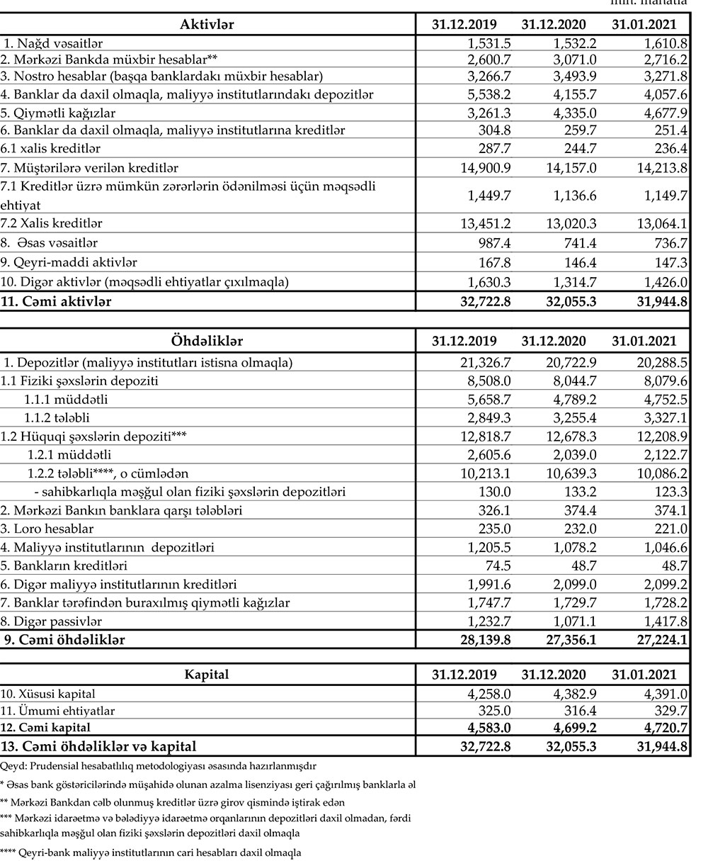 2021-ci ilin Yanvar ayında fiziki şəxslərin (əhalinin) banklardakı müddətli əmanətləri 36,7 milyon manat azalaraq 4 milyard 752,5 milyon manata düşüb. Dekabrın sonunda fiziki şəxslərin banklardakı müddətli əmanətləri 4 milyard 789,2 milyon manat təşkil etmişdi.