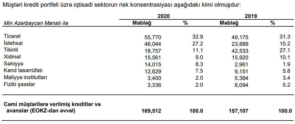 31 dekabr 2020-ci il tarixinə Bankın məbləği 1 milyon manatdan yüksək olan 34 borcalanı mövcud olmuşdu. Bu kreditlərin ümumi məbləği 129 milyon 57 min manat və ya ümumi kredit portfelinin 76% olmuşdur.