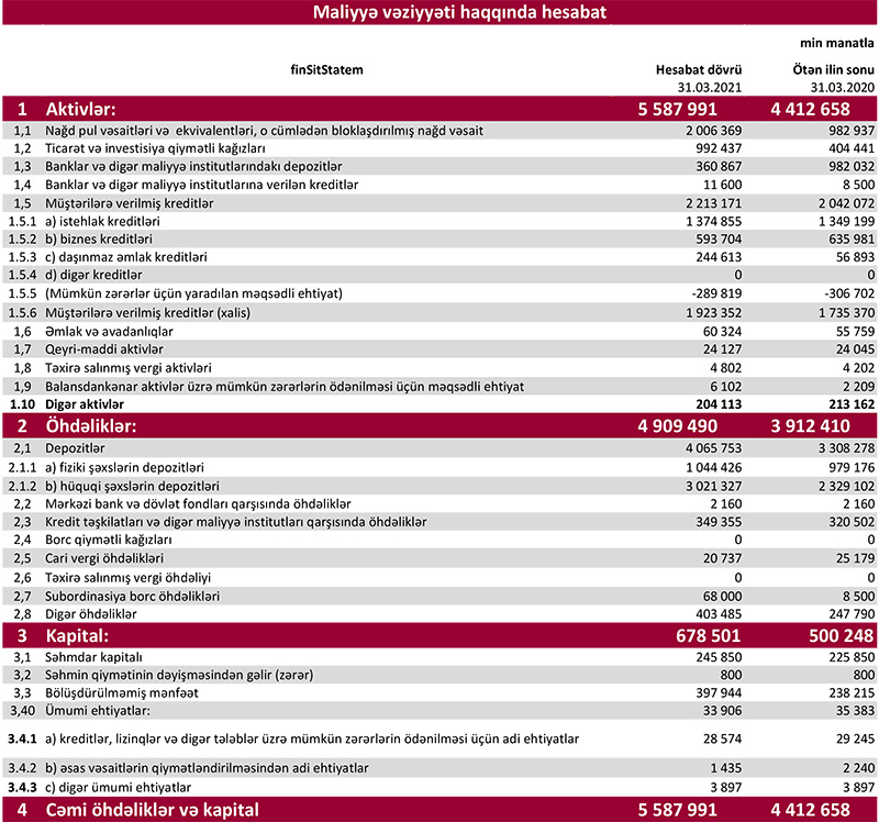 31 Mart 2021-ci il tarixində "Kapital Bank" 5 milyard 587 milyon 991 min manat cəmi aktivlərə malik olub. Aktivlərin 2 milyard 213 milyon 171 min manatını müştərilərə verilmiş kreditlər təşkil edib. Ötən ilin eyni dövründə Kapital Bank 4 milyard 412 milyon 658 min manat cəmi aktivlərə, 2 milyard 42 milyon 72 min manat kredit portfelinə malik idi. Aktivlərin artması Bankın müştərilərinin depozitlərinin artması ilə əlaqədar olaraq nağd pul vəsaitlərinin artmasıdır.