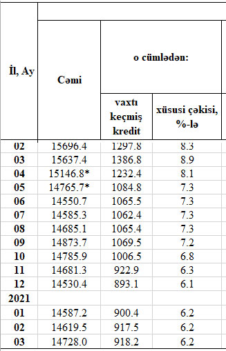 31 Mart 2021-ci il tarixində cəmi kredit qoyuluşlarının 918,2 milyon manatını və ya 6,2%-ni ödəmə vaxtı keçmiş kreditlər təşkil edib. Ötən ilin sonunda ödəmə vaxtı keçmiş kreditlər 893,1 milyon manat, Fevralın sonunda isə 917,5 milyon manat təşkil etmişdi.