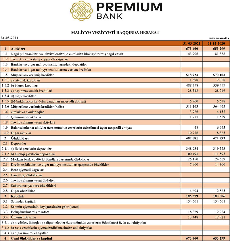 31 Mart 2021-ci il tarixində “Premium Bank” 673 milyon 460 min manat cəmi aktivlərə, o cümlədən 518 milyon 923 min manat kredit portfelinə (müştərilərə verilmiş kreditlər) malik olub. Bank ötən ilin sonunda 653 milyon 299 min manat cəmi aktivlərə və 570 milyon 103 min manat cəmi kredit portfelinə malik idi. Aktivlərin artması nağd pul vəsaitlərinin artmasından qaynaqlanır.