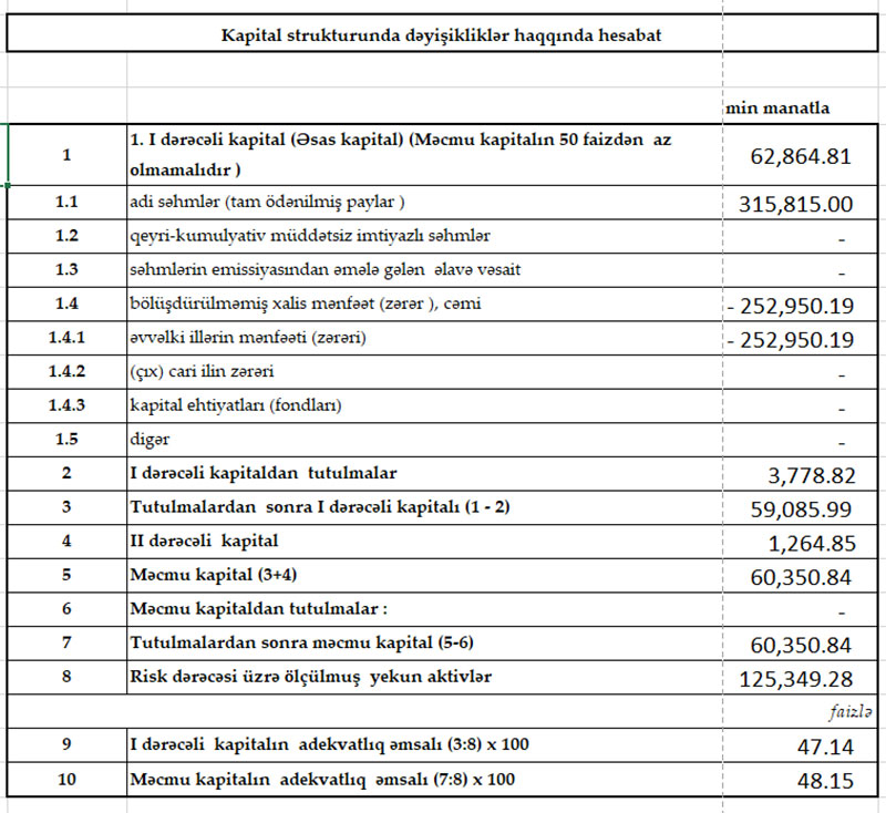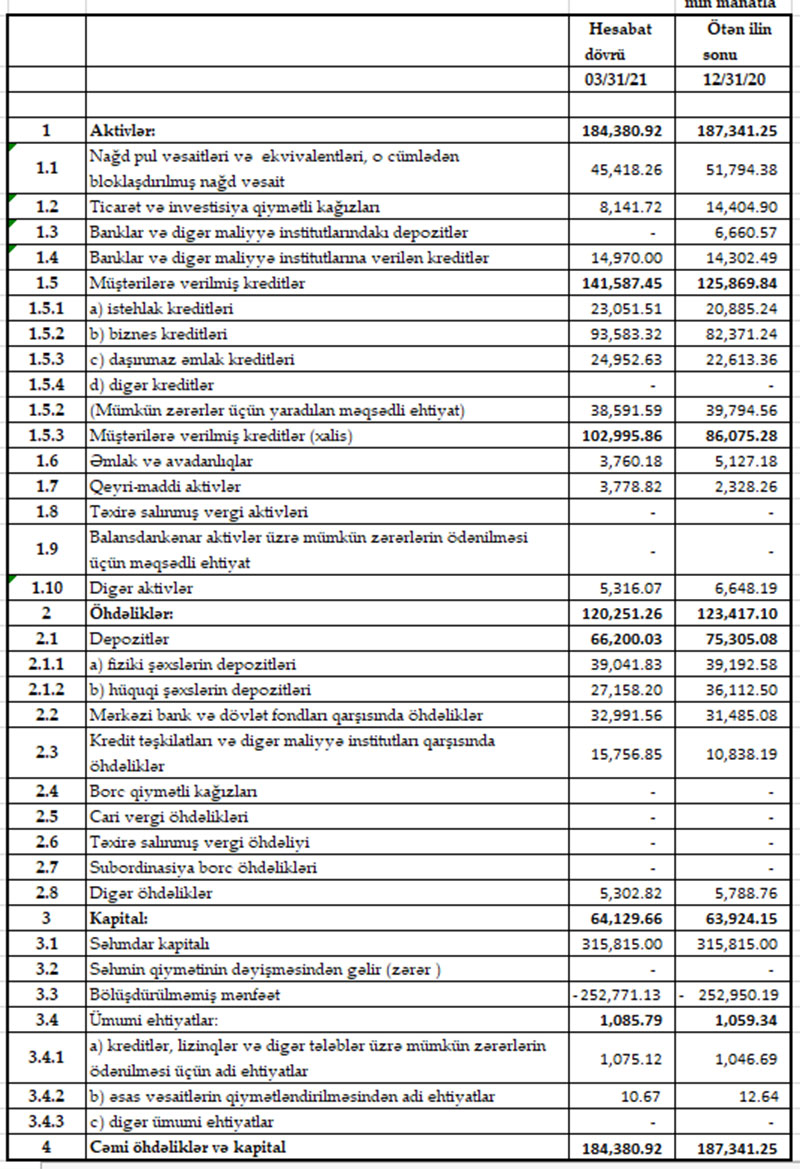 Müqayisə üçün qeyd edək ki, 2020-ci ilin ilk rübündə də “VTB Bank Azərbaycan”ın xərcləri gəlirlərini üstələdiyindən 3 milyon 640 min manat əməliyyat zərəri yaranmışdı. Mümkün zərərlər üçün yaradılan məqsədli ehtiyatlardan azad olmuş 5 milyon 39 min manat hesabına həm əməliyyat zərəri bağlanmış, həm də Bankın 1 milyon 399 min manat xalis mənfəəti formalaşmışdı.