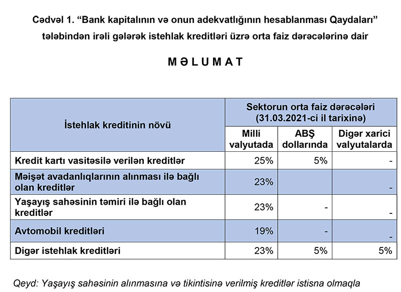 Marja Mərkəzi Bankın "İstehlak kreditləri üzrə orta faiz dərəcələrinə dair məlumat"ına istinadən xəbər verir ki, 31 Mart 2021-ci il tarixində kredit kartı vasitəsilə verilən kreditlər üzrə orta faiz dərəcəsi 25% təşkil edib. Bu dərəcə ötən ilin Mart ayının sonunda 23%, Dekabr ayının sonunda isə 24% idi.