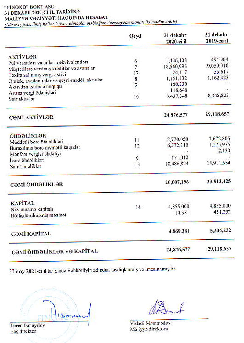 Hesabat dövründə “Finoko”nun öhdəlikləri 16% azalaraq 20 milyon 7 min manata, balans kapitalı isə 8,2% azalaraq 4 milyon 869 min manata düşüb.