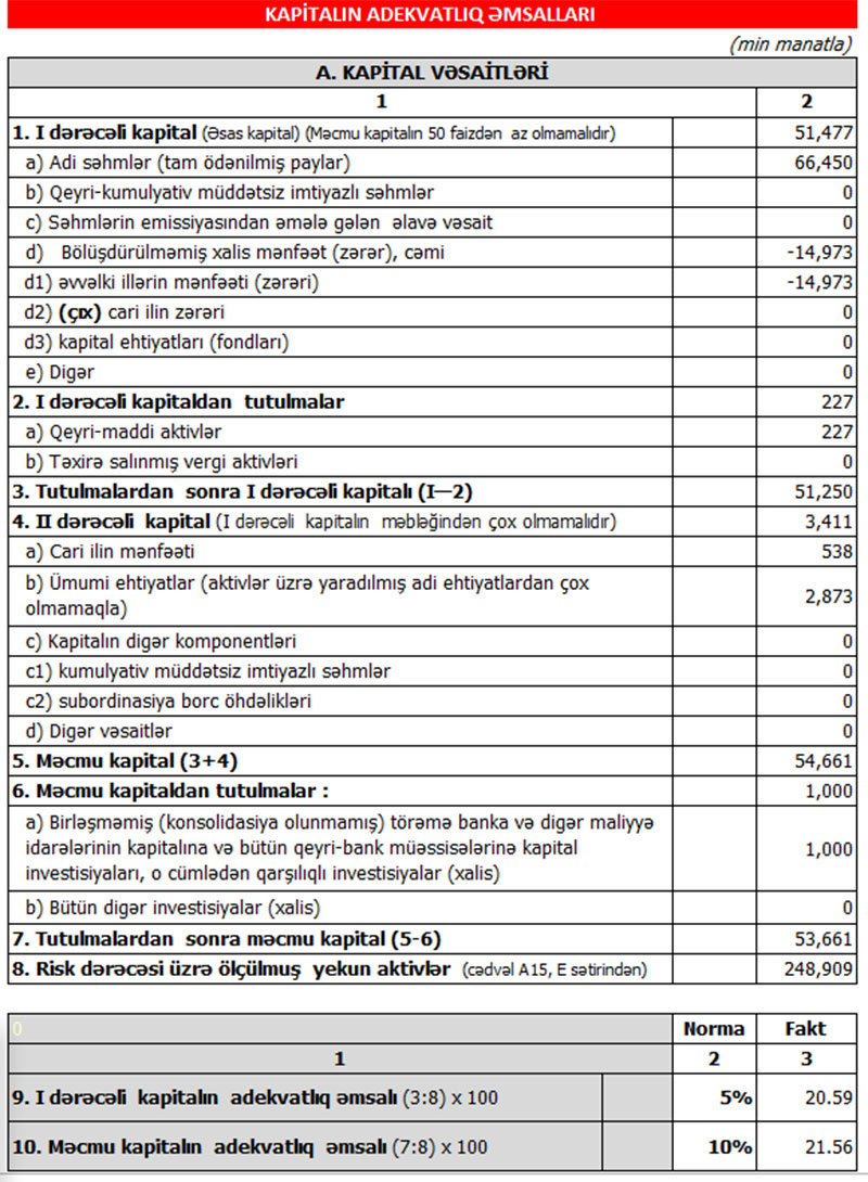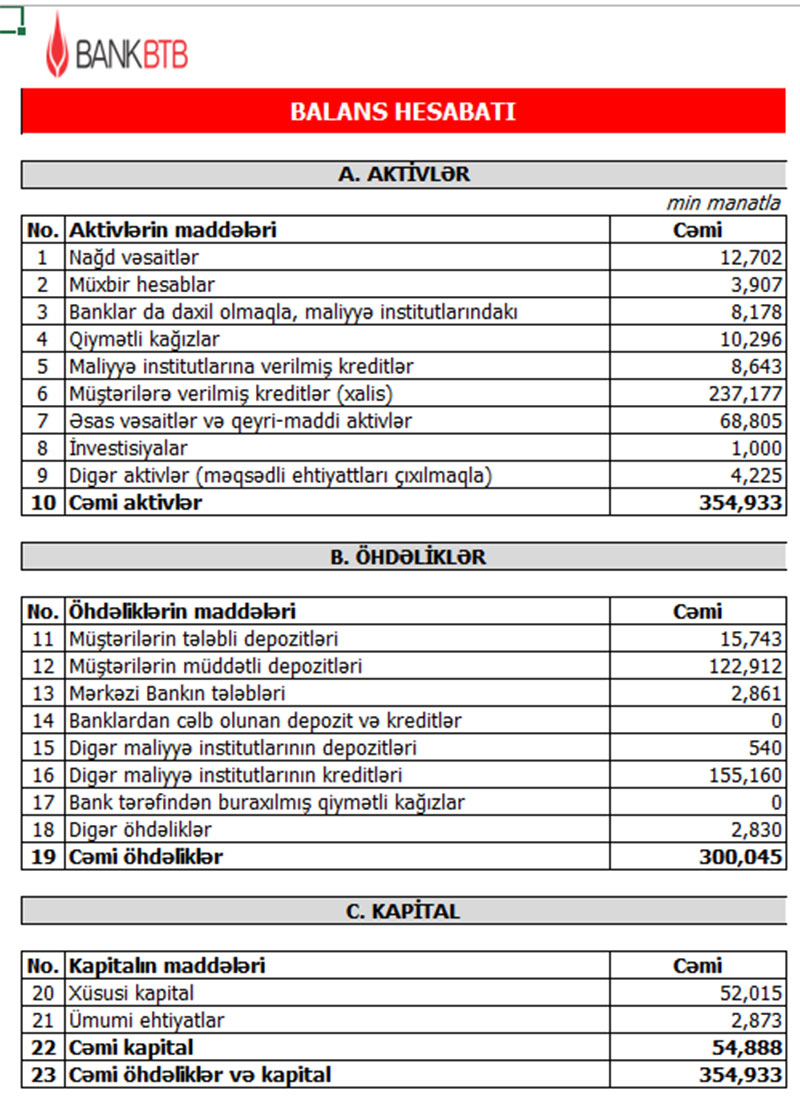 Müqayisə üçün qeyd edək ki, 2020-ci ilin yanvar-iyun dövründə “Bank BTB”nin cəmi əməliyyat gəlirləri 15 milyon 552 min amant, cəmi əməliyyat xərcləri 14 miylon 640 min manat, əməliyyat mənfəəti 912 min manat təşkil etmişdi. Bank aktivlər üzrə mümkün zərərlərin ödənilməsi üçün xüsusi ehtiyatın yaradılmasına 1 milyon 19 min manat ayırdığından həmin dövrü 107 min manat xalis zərər ilə bağlamışdı.