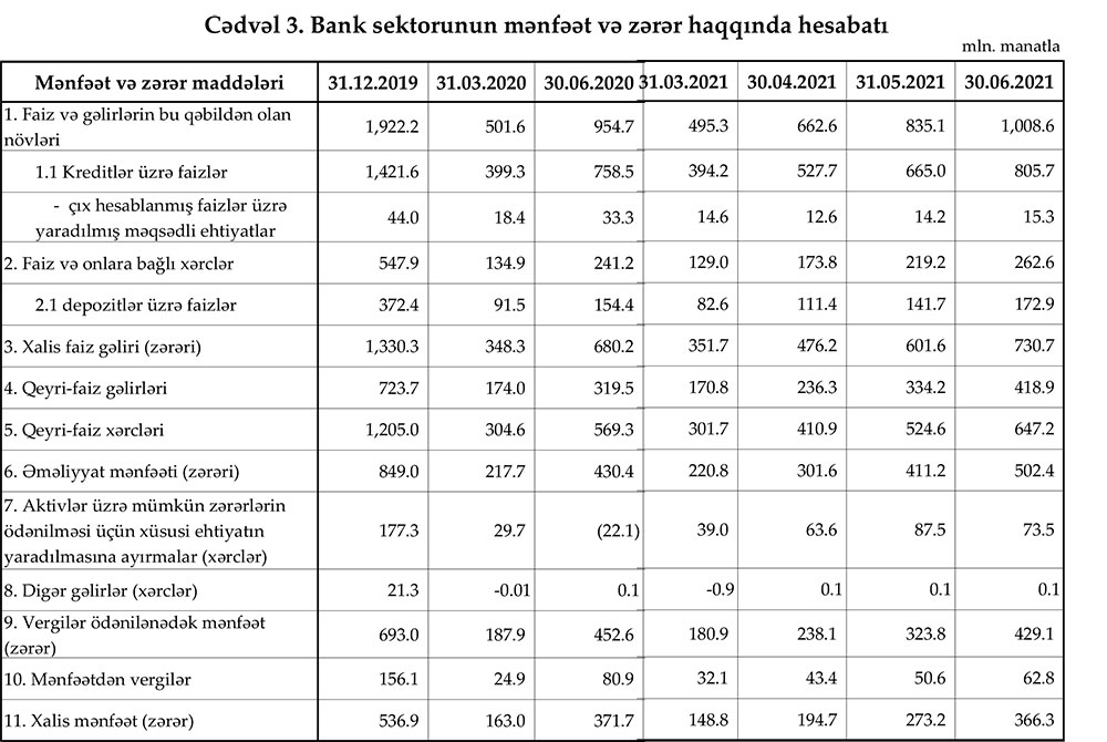 2021-ci ilin yanvar-iyun dövründə bankların cəmi faiz gəlirləri 1 milyard manatdan çox - 1 milyard 8,6 milyon manat təşkil edib (ötən ilin eyni dövründə 954,7 milyon manat). Bankların yarımilllik qeyri-faiz gəlirləri isə 319,5 milyon manatdan 418.9 milyon manata yüksəlib.