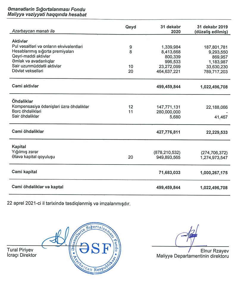 Əmanətlərin Sığortalanması Fondu 2020-ci ili 602 milyon 81 min manat xalis zərər ilə başa vurub. Halbuki, Fond 2019-cu ili 59 milyon 630 min manat xalis mənfəət ilə bağlamışdı.