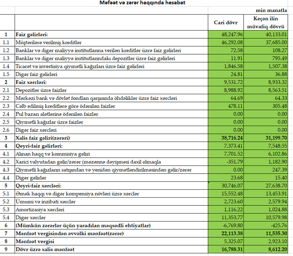 Xatırladaq ki, 2021-ci ilin yanvar-sentyabr dövründə “Bank of Baku”nun cəmi əməliyyat gəlirləri (faiz və qeyri-faiz gəlirləri) 47 milyon 681 min manat, cəmi əməliyyat xərcləri (faiz və qeyri-faiz xərcləri) 36 milyon 572 min manat təşkil etmişdi. Gəlirlər xərcləri üstələdiyindən Bankın 11 milyon 109 min manat əməliyyat mənfəəti yaranmışdı. Eyni zamanda, mümkün zərərlər üçün yaradılan məqsədli ehtiyatlardan azad olmuş 426 min manat mənfəətə əlavə edilmiş və mənfəət 11 milyon 535 min manata yüksəlmişdi. “Bank of Baku” 2 milyon 923 min manat mənfəət vergisi ödədiyindən ötən ilin 9 ayını 8 milyon 612 min manat xalis mənfəət ilə bağlamışdı.