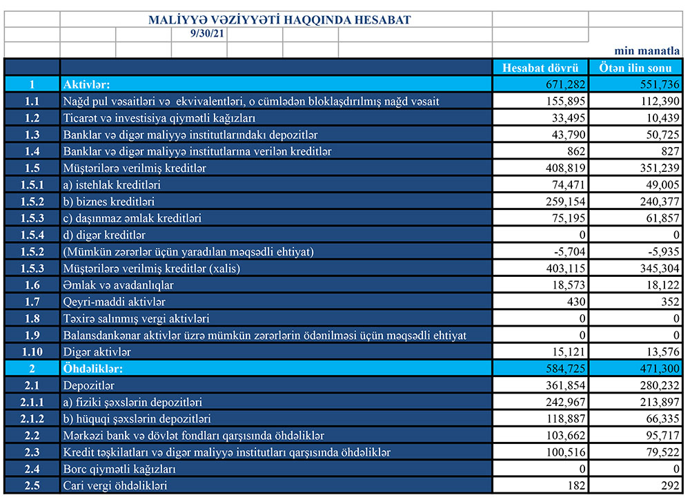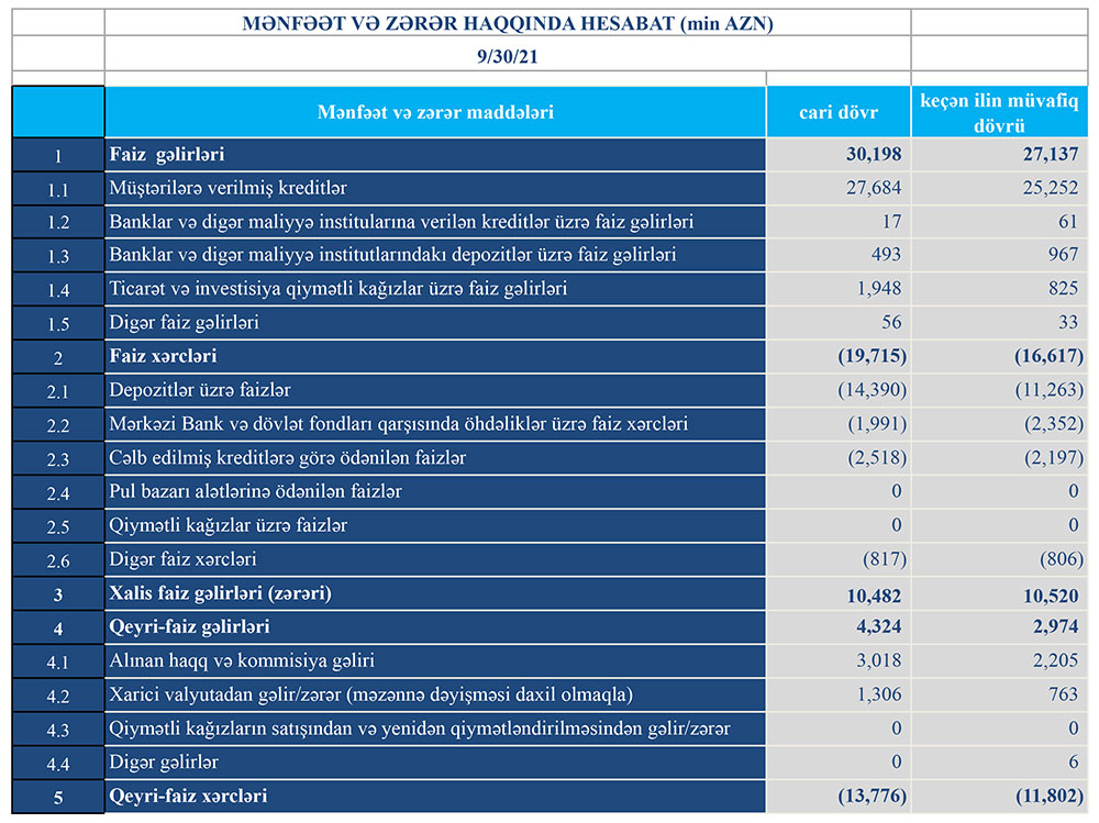 Müqayisə üçün qeyd edək ki, 2020-ci ilin yanvar-sentyabr dövründə “Turanbank”ın cəmi əməliyyat gəlirləri 30 milyon 111 min manat, cəmi əməliyyat xərcləri 28 milyon 419 min manat, əməliyyat mənfəəti 1 milyon 692 min manat təşkil etmişdi. Bank mümkün zərərlər üçün yaradılan məqsədli ehtiyata 278 min manat ayırdığından həmin dövrü 1 milyon 414 min manat xalis mənfəət ilə bağlamışdı.