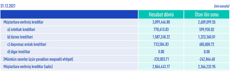 Azərbaycanın ən böyük bankı olan dövlətə məxsus ABB-nin cəmi kredit portfeli (müştərilərə verilmiş kreditlər) 2021-ci ildə 2020-ci illə müqayisədə 490 milyon 347 min manat və ya 18,8% artaraq 3 milyard 99 milyon 447 min manata yüksəlib.