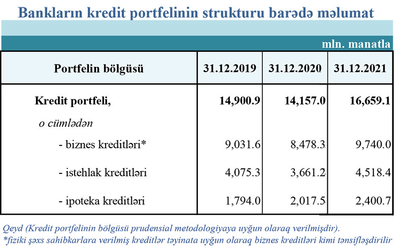 Ümumilikdə, 2021-ci il ərzində bankların kredit portfeli 17.7% (2 milyard 502.1 milyon manat) artaraq 16 milyard 659.1 milyon manat təşkil etmişdir.
