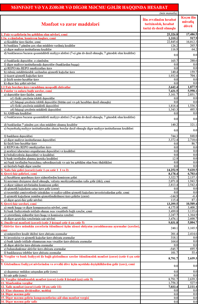 Müqayisə üçün qeyd edək ki, 2020-ci ildə “Ziraat Bank Azərbaycan”ın 5 milyon 805 min manat əməliyyat mənfəətindən ehtiyatlara 3 milyon 165 min manat ayırdığından və 527 min manat mənfəət vergisi ödədiyindən həmən ili 2 milyon 111 min manat xalis mənfəət ilə başa vurmuşdu.