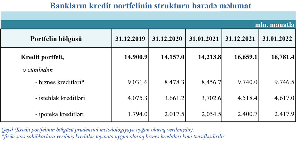 2022-ci ilin yanvar ayında biznes kreditləri 6,5 milyon manat artaraq 9 milyard 746,5 milyon manata, istehlak kreditləri 98,6 milyon manat artaraq 4 milyard 617 milyon manata, ipoteka kreditləri isə 17,2 milyon manat artaraq 2 milyard 417,9 milyon manata çatıb.