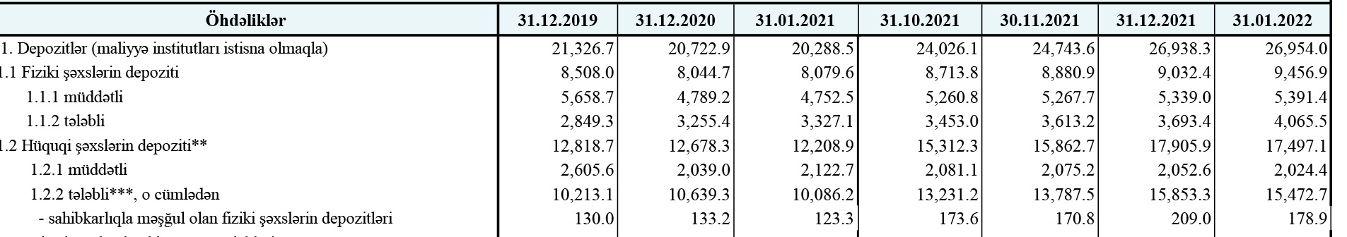 2022-ci ilin yanvar ayında 52,4 milyon manat artmış müddətli depozitlər ötən ilin noyabr ayında 160,2 milyon manat, dekabr ayında 80,2 milyon manat artmışdı. Müddətli əmanətlərin artım tempinin aydan-aya azalması inflyasiya əlqaqədr olaraq manat əmanətlərinə olan tələbin azaldığını göstərir. Azərbaycanda illik inflyasiya (12,5%) bankların təklif etdikləri əmanət faizlərini (əsasən 6-11% civarında) üstələyib. Qısası, əmanətətçilər real olaraq zərər ilə üzləşiblər.