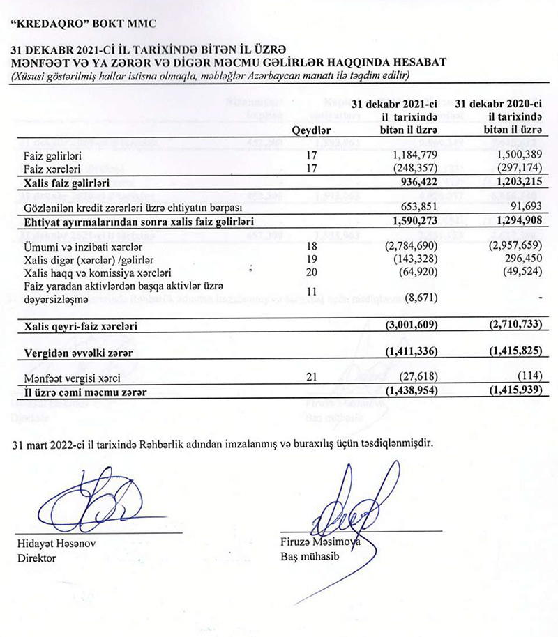 “Kred Aqro” BOKT MMC 2021-ci ili 1 milyon 439 min manat xalis zərər ilə başa vurub. Təşkilat 2020-ci ili 1 milyon 416 min manat xalis zərər ilə bağlamışdı. Beləliklə, “Kred Aqro” BOKT-un xalis zərəri 1,6% artıb.