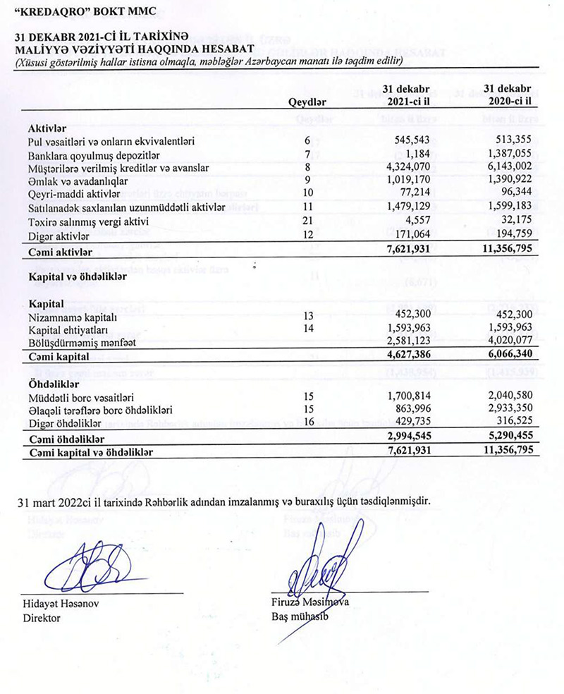 Ötən il “Kred Aqro”nun kredit portfeli 42% azalaraq 2020-ci ilin sonundakı 6 milyon 143 min manatdan 4 milyon 324 min manata geriləyib.