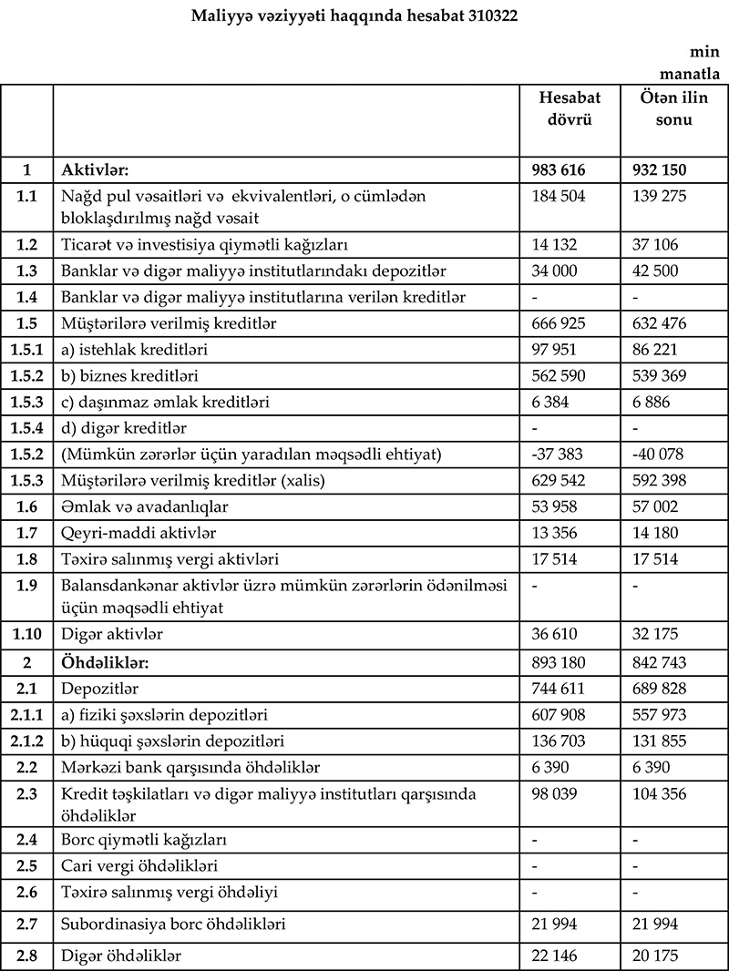 Bankın yaydığı press-relizdə bildirilir ki, Birinci rübün sonuna bankın aktivləri 984 milyon manat təşkil edib.