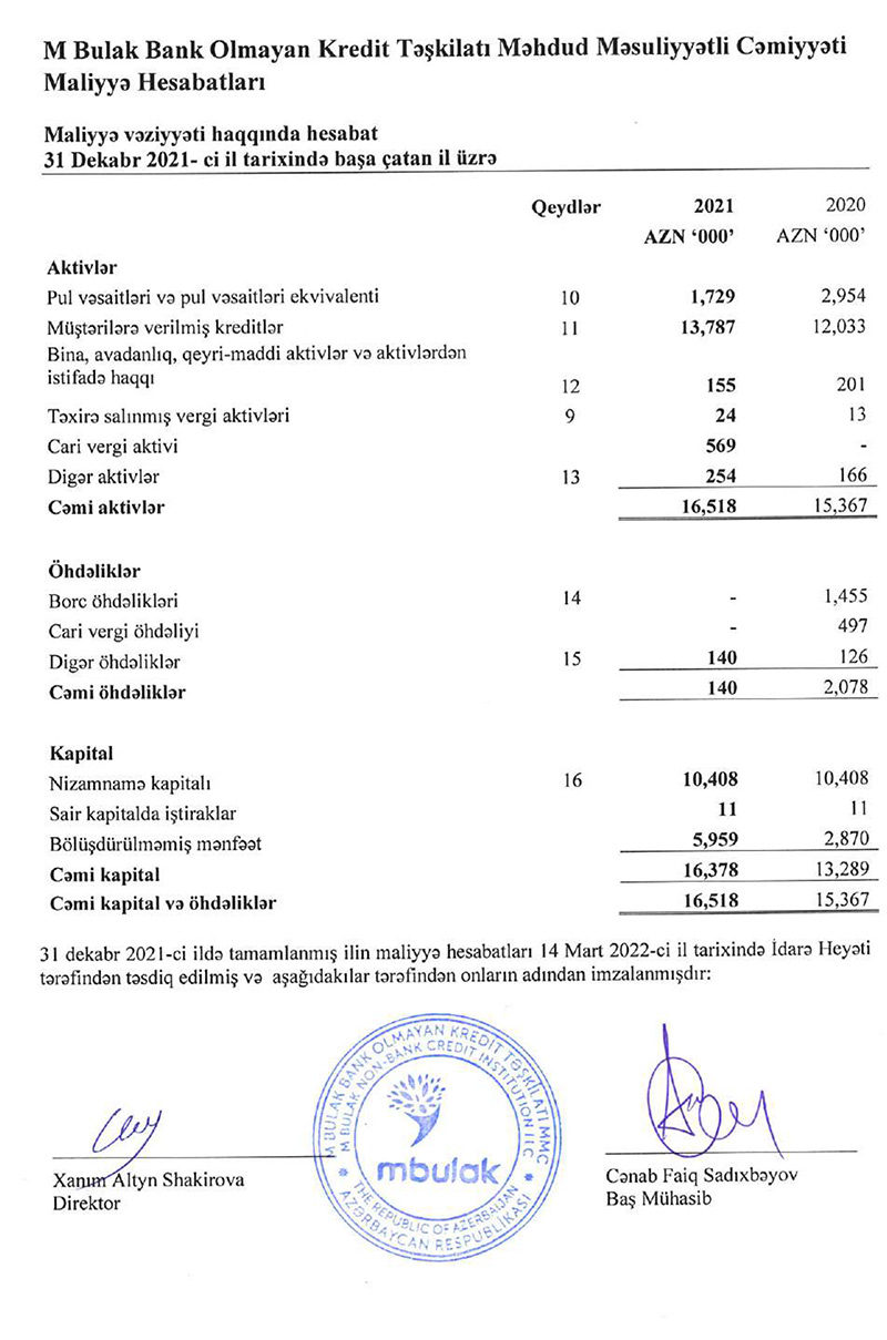 "M Bulak Bank Olmayan Kredit Təşkilatı" MMC 2021-ci ili 3 milyon 89 min manat xalis mənfəət ilə başa vurub. Halbuki, təşkilat 2020-ci ili 309 min manat xalis zərər ilə bağlamışdı. Bunun səbəbi ehtiyatlara 5 milyon 582 min manat ayrılması idi. 2021-ci ildə isə, əksinə, ehtiyatdan azad olmuş 580 min manat mənfəətə əlavə edilib.