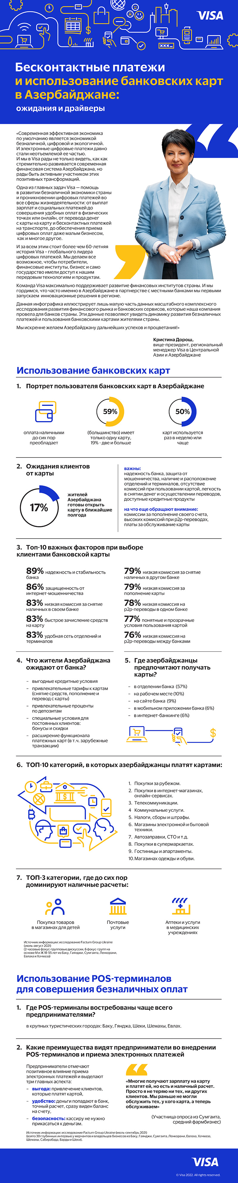 Araşdırmanın nəticələrinə görə, respublika vətəndaşlarının təxminən 17%-i yaxın altı ayda kart açmağa hazırdır. Eyni zamanda, azərbaycanlılar bankın etibarlılığına, fırıldaqçılıqdan qorunma səviyyəsinə, filial və terminalların mövcudluğuna və yerləşməsinə, kartdan istifadə zamanı komissiyaların olmamasına, eləcə də kredit məhsullarının mövcudluğuna, pulun çıxarılması və köçürmələrin aparılmasının asanlığına xüsusi diqqət yetirirlər. Bundan əlavə, istehlakçılar maliyyə institutu və bank məhsullarını seçərkən hesablarının doldurulması və ya P2P köçürmələrinin həyata keçirilməsi üçün komissiyalar, eləcə də kartın texniki xidmət haqqı kimi parametrləri də vacib hesab edirlər.