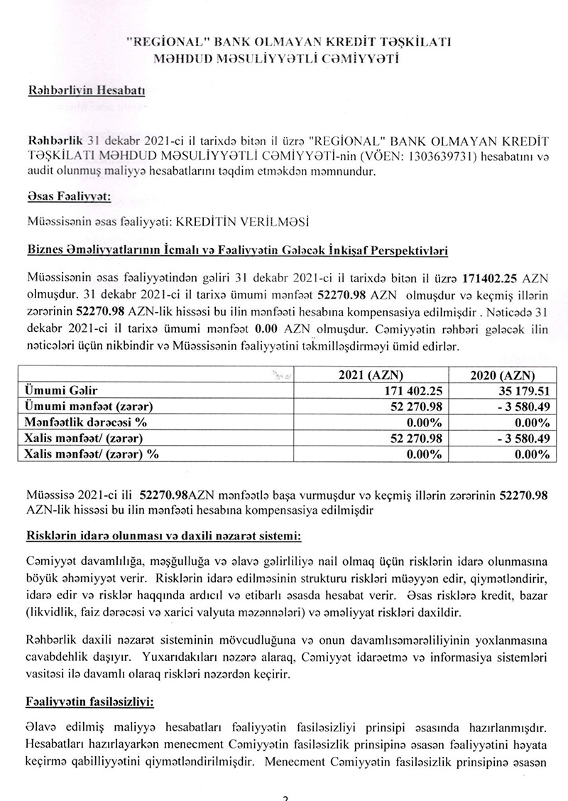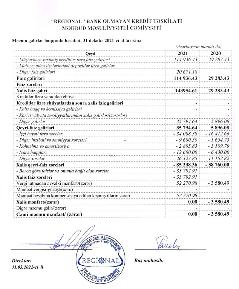 “Regional” BOKT MMC 2021-ci ili 52 min 271 manat xalis mənfəət ilə başa vurub. BOKT 2020-ci ili 3 min 580 manat xalis zərər ilə bağlamışdı.