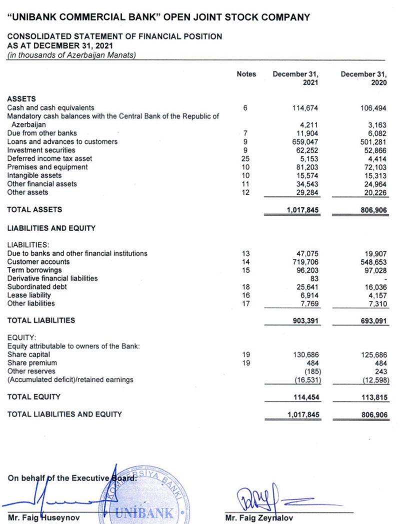 "Unibank Kommersiya Bankı" ASC Maliyyə Hesabatlarının Beynəlxalq Standartları əsasında konsolidə edilmiş (Unibank və Unicapital) audit hesabatlarını açıqlayıb.