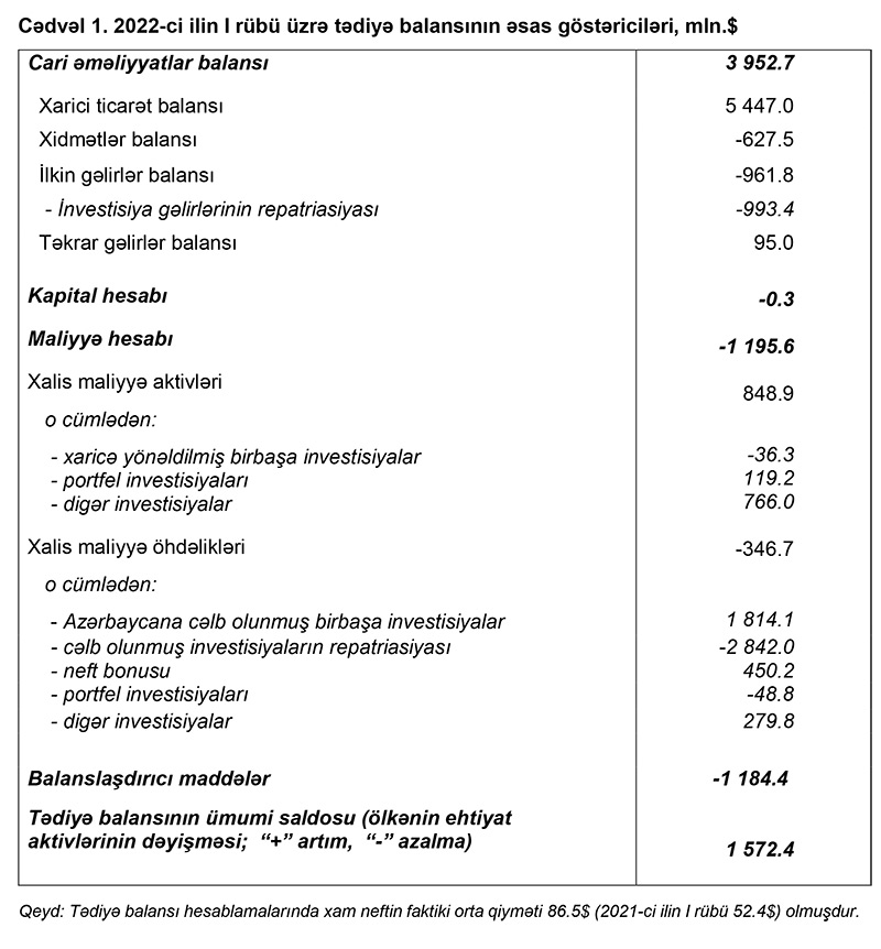 Mərkəzi Bank qeyd edib ki, 2022-ci ilin 1-ci rübündə tədiyə balansı əsasən qlobal əmtəə bazarlarında neft-qaz qiymətlərinin və qeyri-neft ixracının əhəmiyyətli artımından təsirlənmişdir. Cari əməliyyatlar balansında 4 milyard dollar profisit, kapital və maliyyənin hərəkəti hesabında isə 1.2 milyard dollar kəsir yaranmış, ehtiyat aktivləri təxminən 1.6 milyard dollar artmışdır.