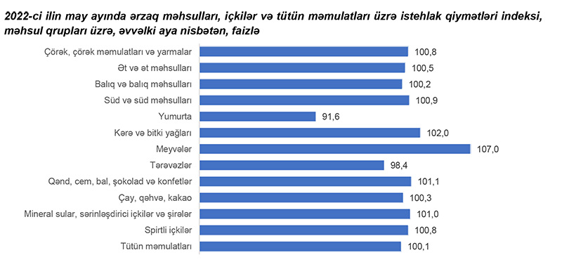 2022-ci ilin may ayında ərzaq məhsulları, içkilər və tütün məmulatları üzrə istehlak qiymətləri indeksi əvvəlki aya nisbətən 1,0 faiz, əvvəlki ilin may ayına nisbətən 20,2 faiz artıb.
