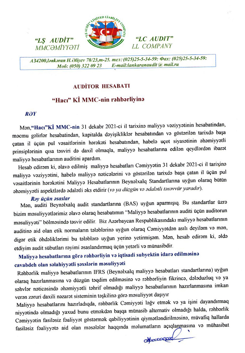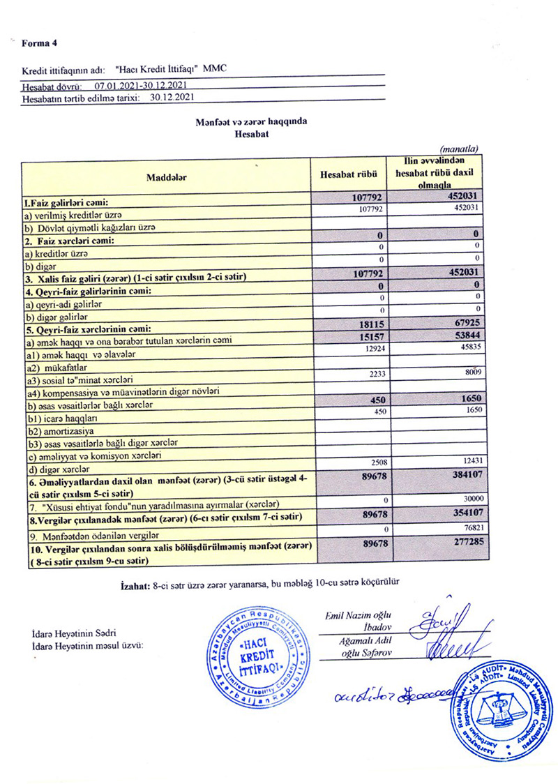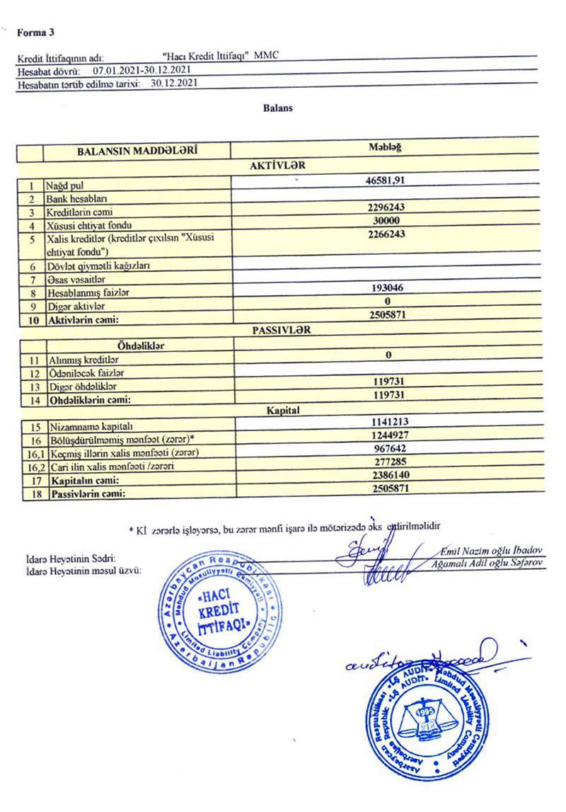 "Hacı Kredit İttifaqı" MMC-nin 31 dekabr 2021-ci il tarixində bitən il üzrə maliyyə hesabatları.