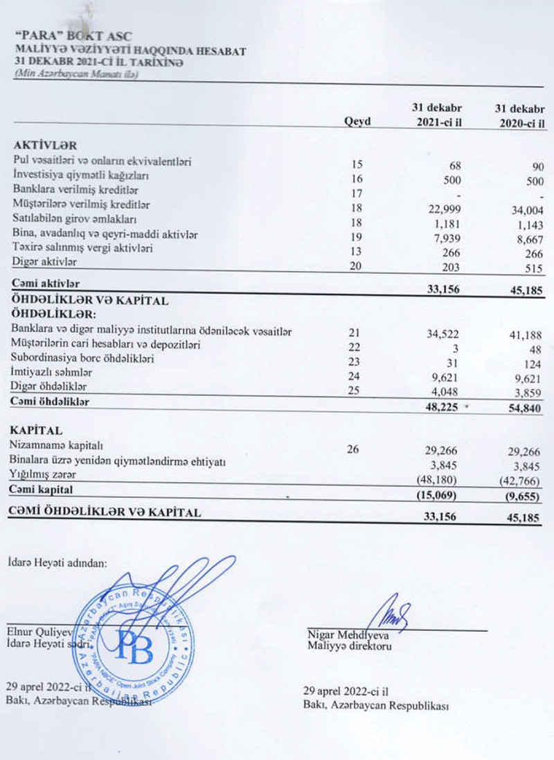Marja.az təşkilatın maliyyə hesabatlarına istinadən xəbər verir ki, yığılmış zərər "Para BOKT"un 29 milyon 266 min manat nizamnamə kapitalını silib. 2021-ci ilin sonunda təşkilatın cəmi kapitalı mənfi 15 milyon 69 min manat olub. 2020-ci ilin sonunda bu rəqəm mənfi 9 milyon 655 min manat idi.