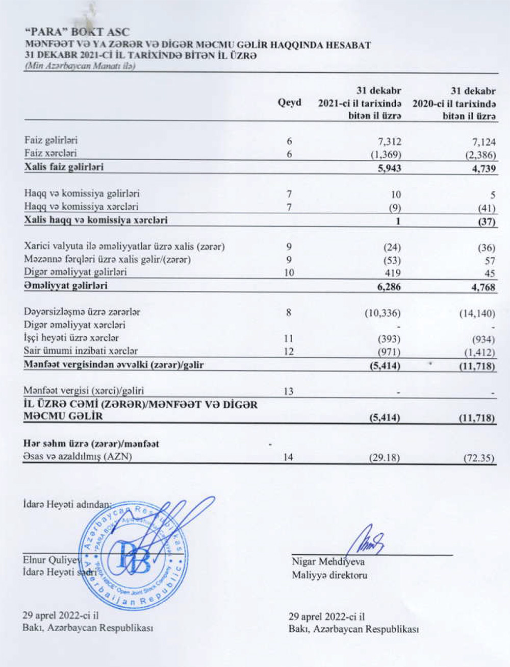 2020-ci ildə "PARA" BOKT-un faiz gəlirləri 7 milyon 124 min manat ikən, 2021-ci ildə 7 milyon 312 min manat təşkil edib.