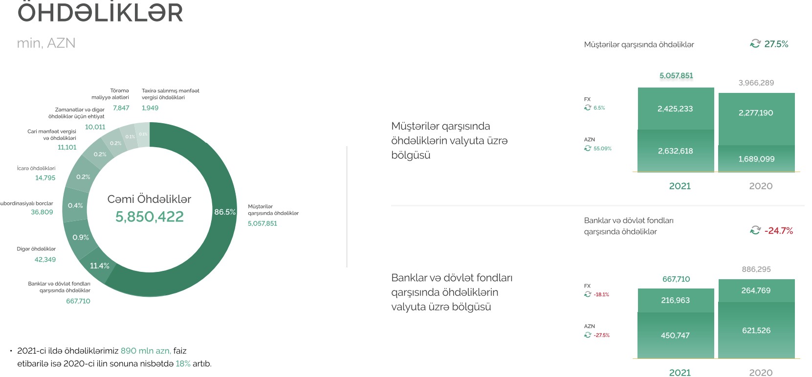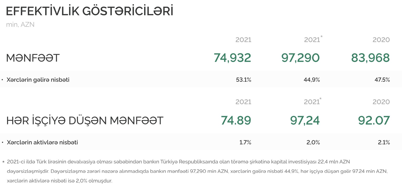 Qeyd edilib ki, 2021-ci ildə Türk lirəsinin devalvasiya olması səbəbindən bankın Türkiyə Respubliksaında olan törəmə şirkətinə kapital investisiyası 22,4 milyon manat dəyərsizləşmişdir. Dəyərsizləşmə zərəri nəzərə alınmadıqda bankın xalis mənfəəti 97 milyon 290 min manat təşkil edib. Ötən il xərclərin gəlirə nisbəti 44,9%, hər işçiyə düşən gəlir 97,24 min manat, xərclərin aktivlərə nisbəti isə 2% olub.
