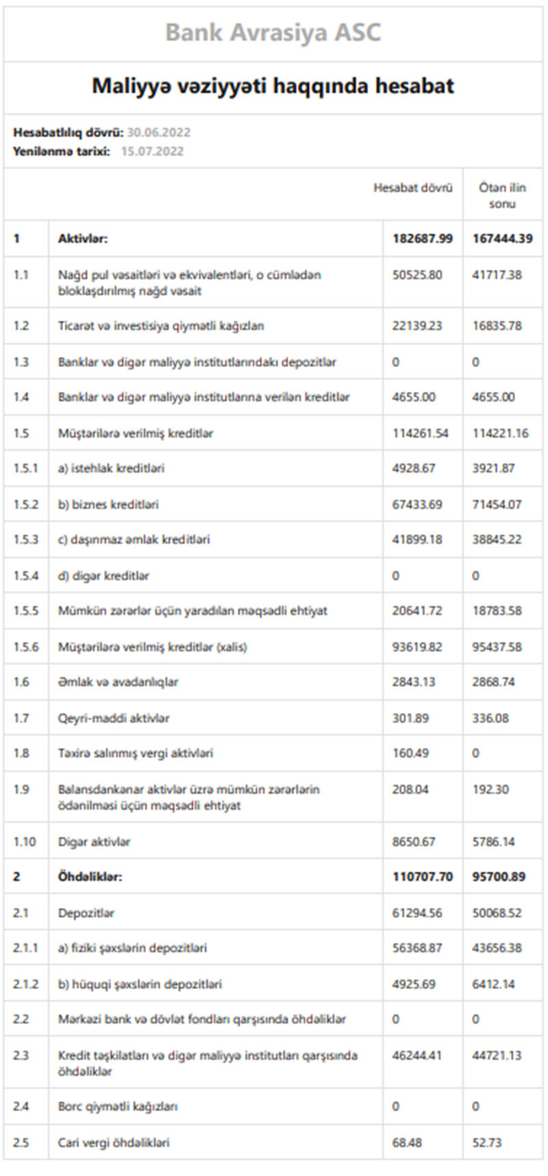 “Bank Avrasiya” maliyyə vəziyyətini açıqladı