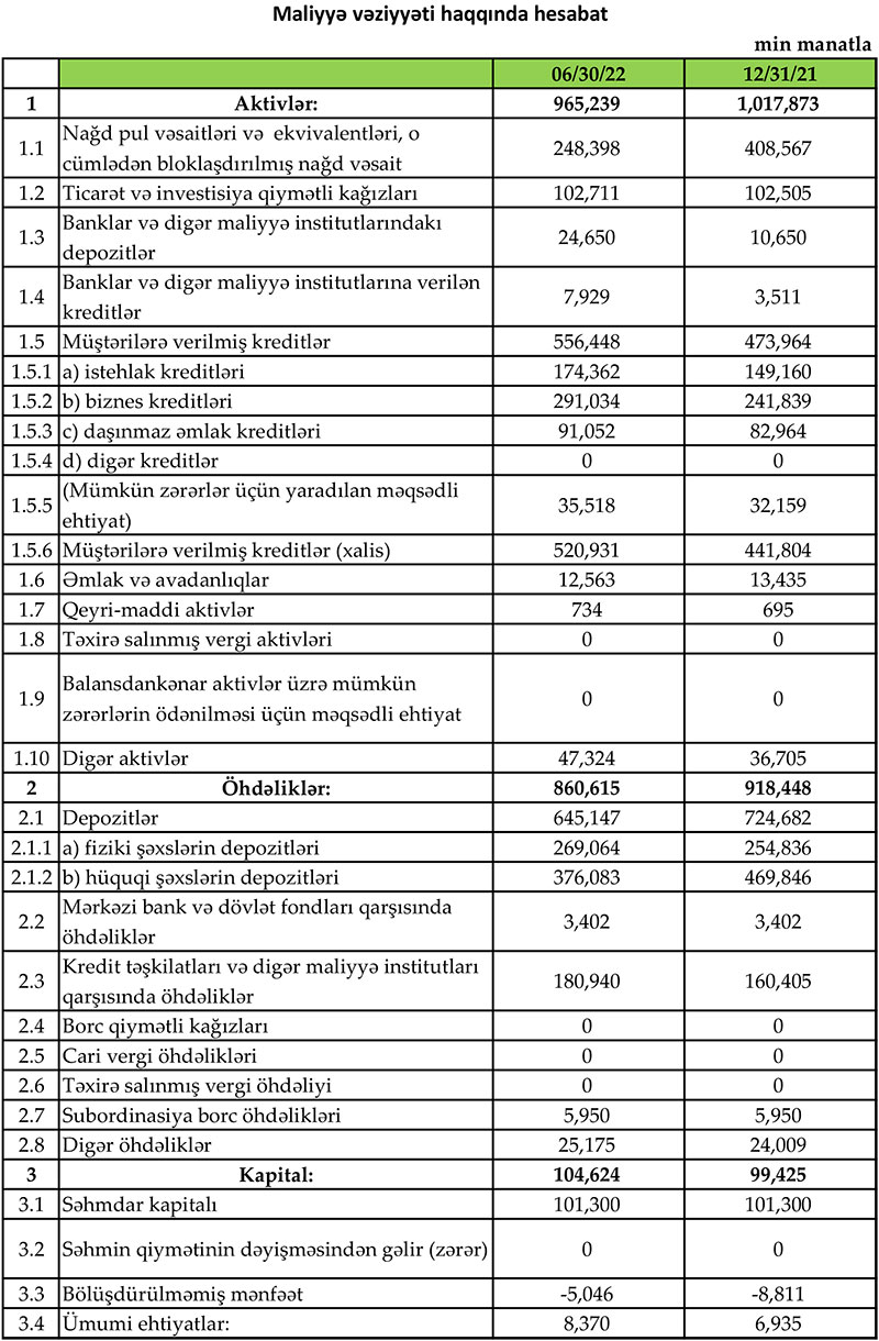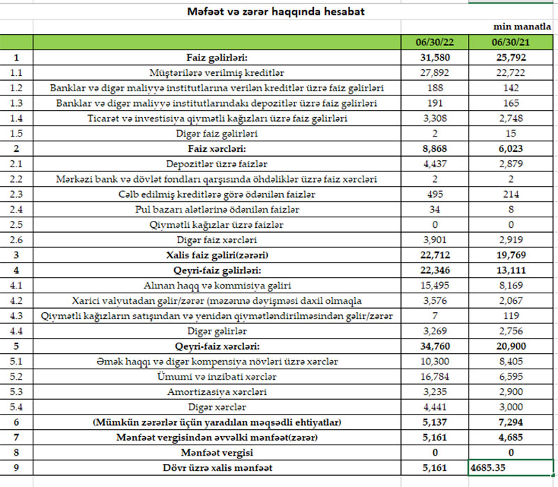 Müqayisə üçün qeyd edək ki, 2021-ci ilin yanvar-iyun dövründə “Rabitəbank” ASC-ın cəmi əməliyyat gəlirləri 38 milyon 903 min manat, cəmi əməliyyat xərcləri 26 milyon 923 min manat, əməliyyat mənfəəti 11 milyon 980 min manat, mümkün zərərlər üçün yaradılan məqsədli ehtiyatlara ayırma 7 milyon 294 min manat, xalis mənfəəti 4 milyon 685 min manat təşkil etmişdi.