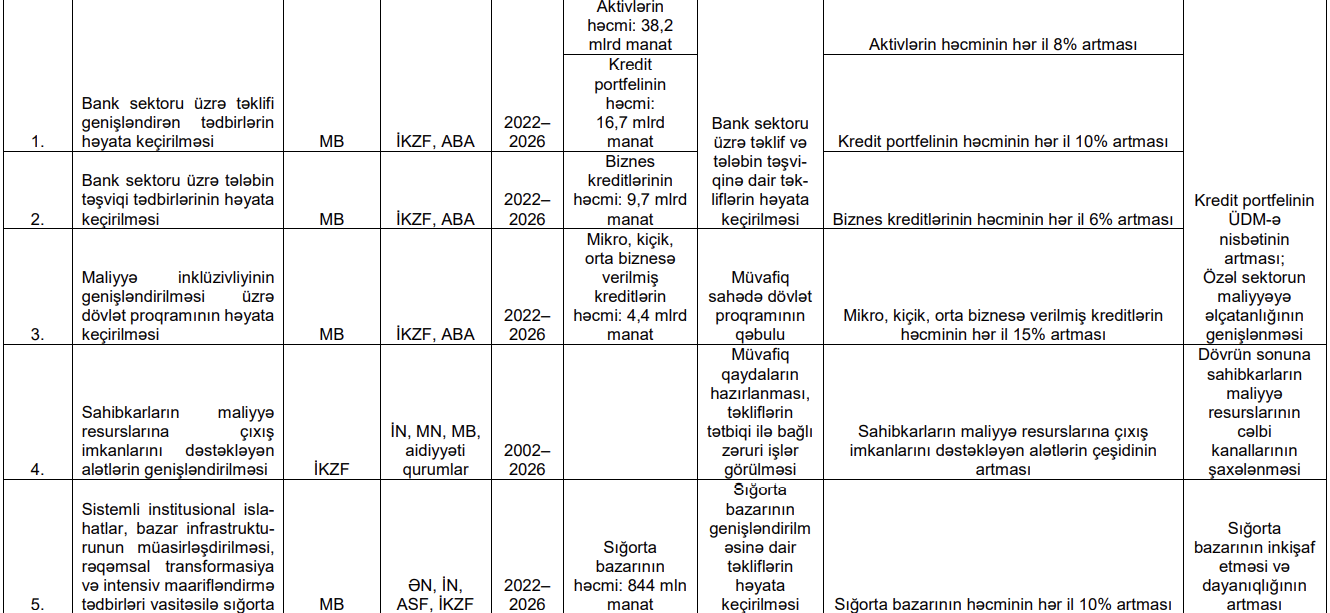 2023-2025-ci illər ərzində, bankların cəmi kredit portfelinin həcminin hər il 10%, biznes kreditlərinin həcminin hər il 6%, mikro, kiçik, orta biznesə verilmiş kreditlərin həcminin hər il 15% artırlması hədəflənir.