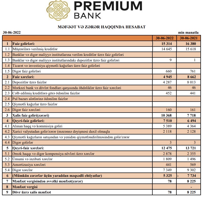 "Premium Bank" ASC 2022-ci ilin 1-ci yarısını (yanvar-iyun dövrünü) 78 min manat xalis mənfəət ilə başa vurub. Halbuki, Bank ötən ilin eyni dövrünü 8 milyon 225 min manat xalis mənfəət ilə başa vurmuşdu. Beləliklə, "Premium Bank"ın xalis mənfəəti 2021-ci ilibn birinci yarısı ilə müqayisədə 2022-ci ilin birinci yarısında 105 dəfədən çox azalıb. Xalis mənfəətin kəskin azalması mümkün zərərlər üçün yaradılan məqsədli ehtiyatlara ayırma ilə əlaqədardır.