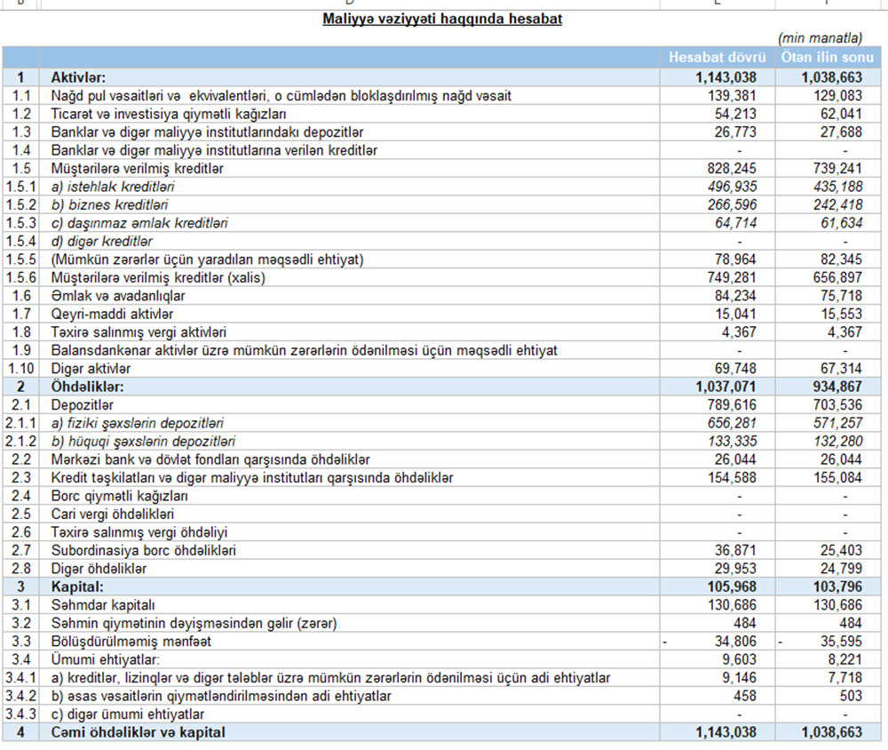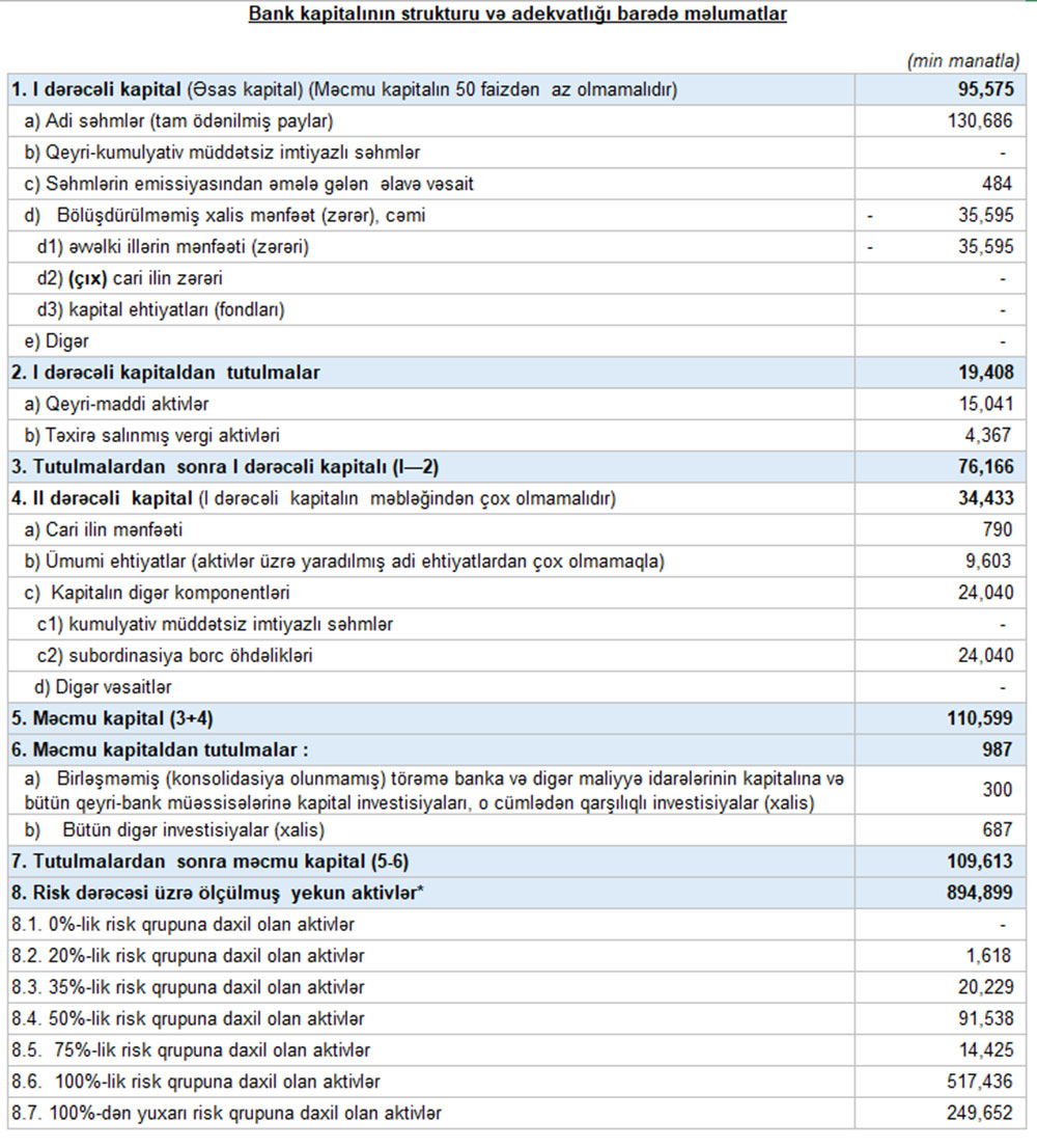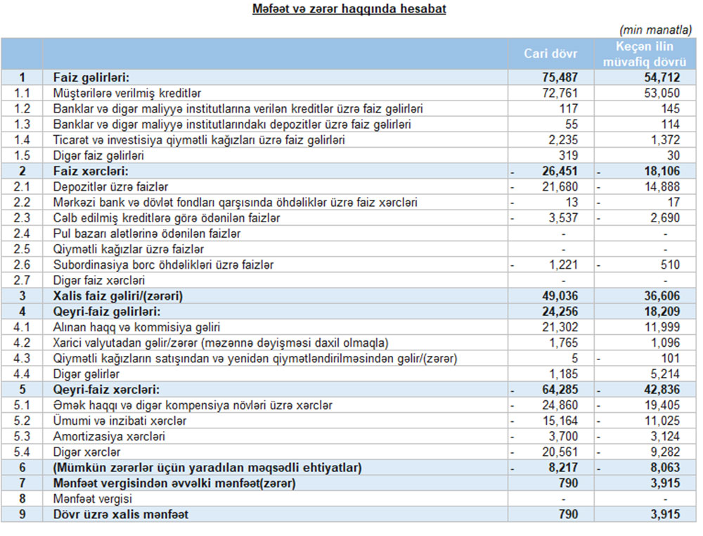Müqayisə üçün qeyd edək ki, 2021-ci ilin birinci yarısında “Unibank”ın cəmi əməliyyat gəlirləri 72 milyon 921 min manat, cəmi əməliyyat xərcləri 60 milyon 942 min manat, əməliyyat mənfəəti 11 milyon 979 min manat, mümkün zərərlər üçün yaradılan məqsədli ehtiyatlara ayırma 8 milyon 63 min manat, xalis mənfəəti 3 milyon 915 min manat təşkil etmişdi.