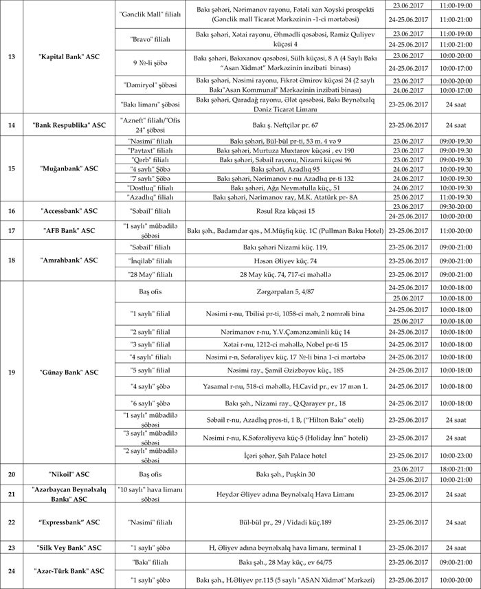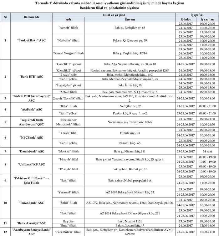Azərbaycan Respublikasının Maliyyə Bazarlarına Nəzarət Palatasının tövsiyəsi ilə “2017 Formula 1 Azərbaycan Qran Prisi” ilə əlaqədar olaraq bir sıra bankların filial və şöbələri gücləndirilmiş iş rejimində çalışacaq.