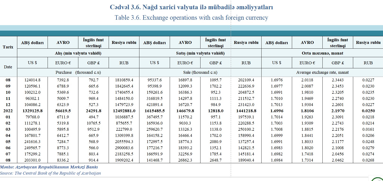 2022-ci ilin aprel, may, iyun və avqust aylarında bankların ABŞ dolları valyutası üzrə nağd alış əməliyyatları nağd satış əməliyyatlarını üstələyib. Qısası, həmin aylarda əhali banklara daha çox dollar satıb.